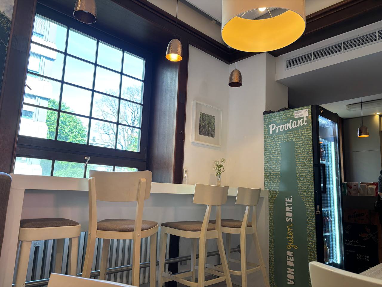 The webentity team is spending today at the LMU Munich Jura Cafe. High bar stools, tall windows onto the courtyard, a "Proviant" fridge in the corner. Good place to think.